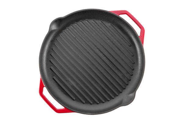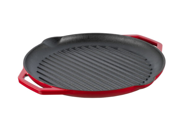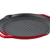 Grand Feu griddle cast-iron pan.  Colour: red. This classic, round cast-iron pan with a coloured enamel coating on the outside and a grill pattern makes it easy to prepare your favourite barbecue food.