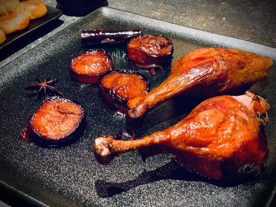 - Put the stand into a roasting tray to catch the duck fat, and place the tray on the grill grates. Cook indirectly at 140°C for about 90 minutes. Save some of the rendered fat, as it will be used later for roasting potatoes. In a separate baking dish, combine plums, star anise, cinnamon, onion, pour in wine and stock, then place the duck on top. Continue cooking indirectly at the same temperature for another 120 minutes. With 20 minutes left, open the grill vents to increase the temperature to 200°C or higher. This will help crisp the skin beautifully. If you notice the liquid reducing too much during cooking, add some water to maintain at least one glass of sauce.