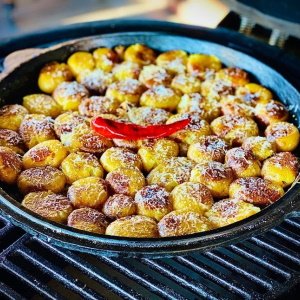 - Place the Grand Feu pot into the grill, add oil, and heat thoroughly. Fry the doughnuts for about 6–8 minutes. Once cooked, dust with powdered sugar.