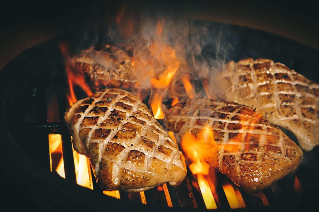 - Sear the duck breasts directly over the coals for 1 minute on each side. Be careful — there will be flames! The internal temperature of the meat should reach about 55°C.