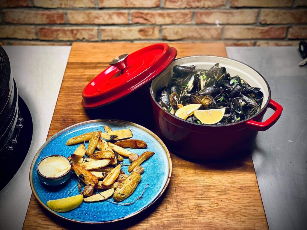 - Serve the mussels with a wedge of lemon and roasted potatoes.