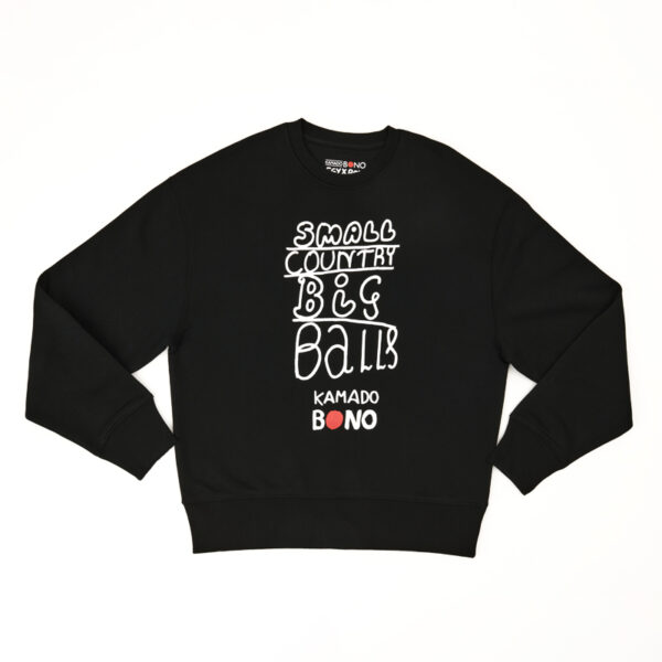 A high-quality and comfy black sweatshirt with the printed text ‘Small country big balls’ – for both men and women. Inner side with fluff. This unique sweatshirt is co-designed with the creative and artistic brand EgyBoy.